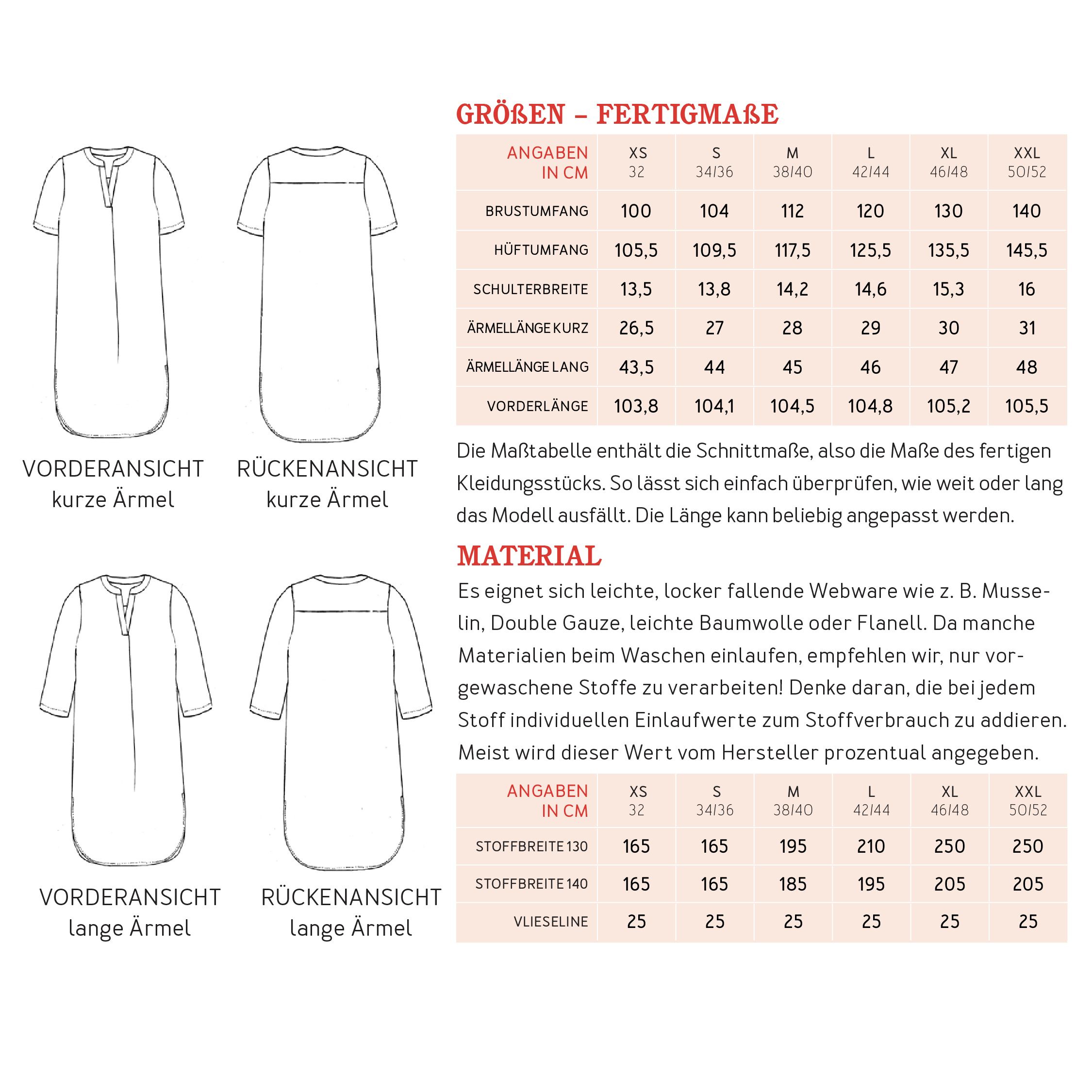 - Materialempfehlung: net sich leichte, locker fallende Webware wie z. B. Musselin, Double Gauze, leichte Baumwolle oder Flanell.