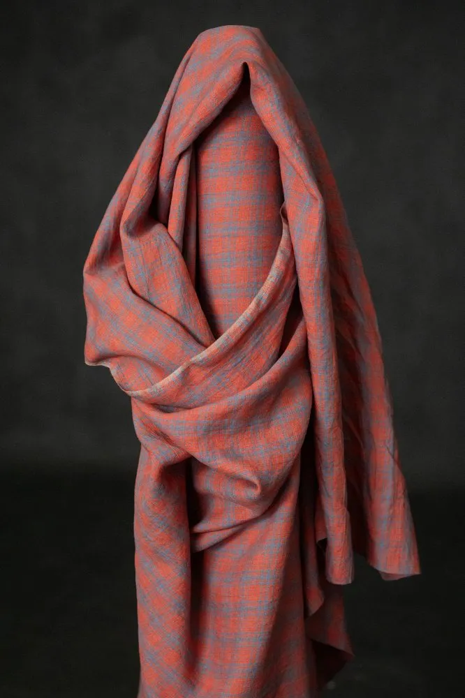 Ein gedecktes Kornblumenblau und ein leuchtendes, spritziges Orange-Rot-Karo. Ein europäisches, gewaschenes Leinen, das in der Weberei für besondere Weichheit getrommelt wurde.