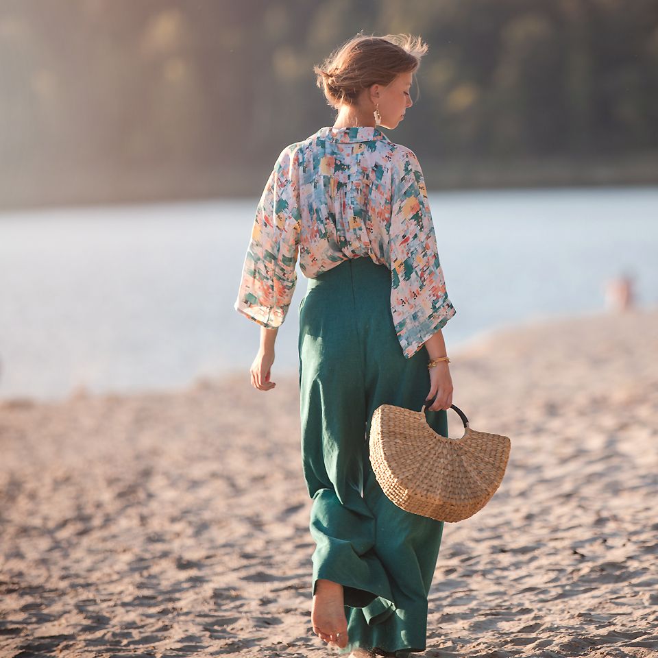 Vorwaschen, da der Stoff beim ersten Waschen um 5 % einläuft. Er knittert weniger, kann aber aufgrund der relativ lockeren Webart des feinen Stoffes recht schnell ausfransen. - Eigenschaften: weicher, fließender Fall